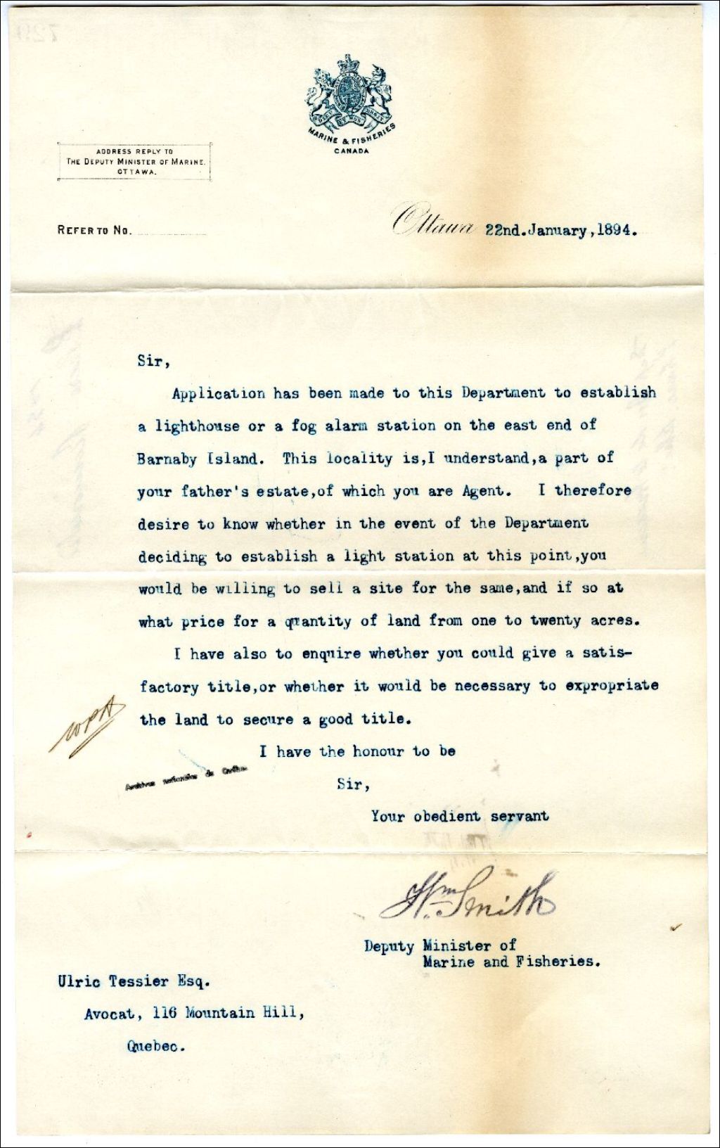 Lettre du Ministre de la Marine et des Pêcheries à Ulric Tessier concernant la construction d'un phare sur l'Île Saint-Barnabé, 22 janvier 1894, Archives nationales à Rimouski, Fonds Famille Tessier, (01R,P1,S3,SS2,P74).