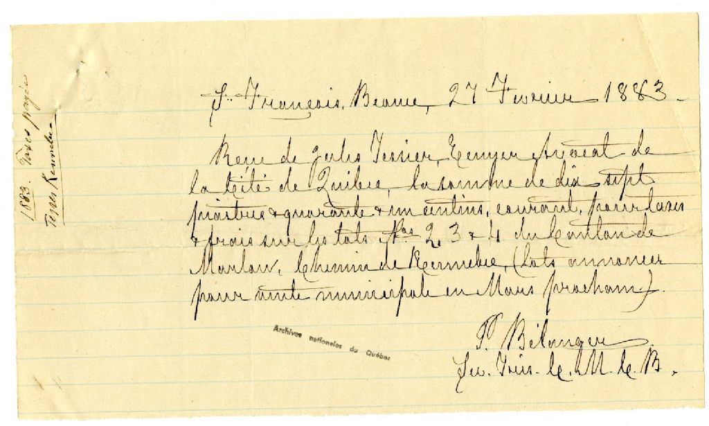Reçu au nom de Jules Tessier suite au paiement des taxes à P. Bélanger, secrétaire trésorier du Conseil municipal du comté de Beauce, 27 février 1883, Archives nationales à Rimouski, Fonds Famille Tessier, (01R,P1,S5,P10).