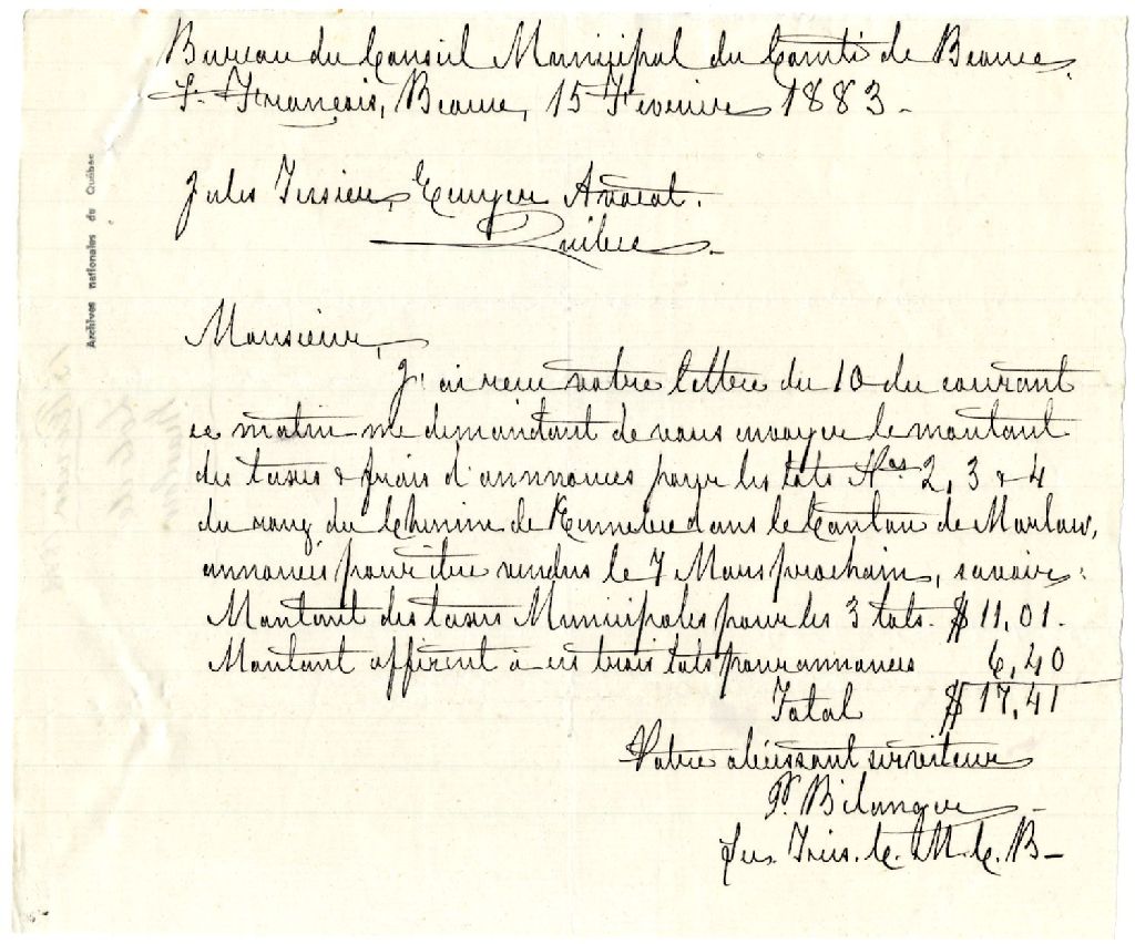 Lettre de P. Bélanger, secrétaire trésorier du Conseil municipal du comté de Beauce concernant les taxes, 15 février 1883, Archives nationales à Rimouski, Fonds Famille Tessier, (01R,P1,S5,P9).