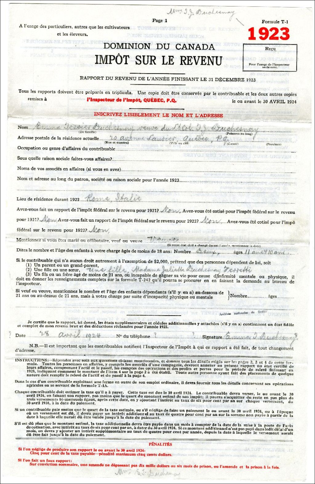 Rapport d'impôt sur le revenu avec reçu d'Emma Tessier veuve d'Henri-Théodore Juchereau Duchesnay