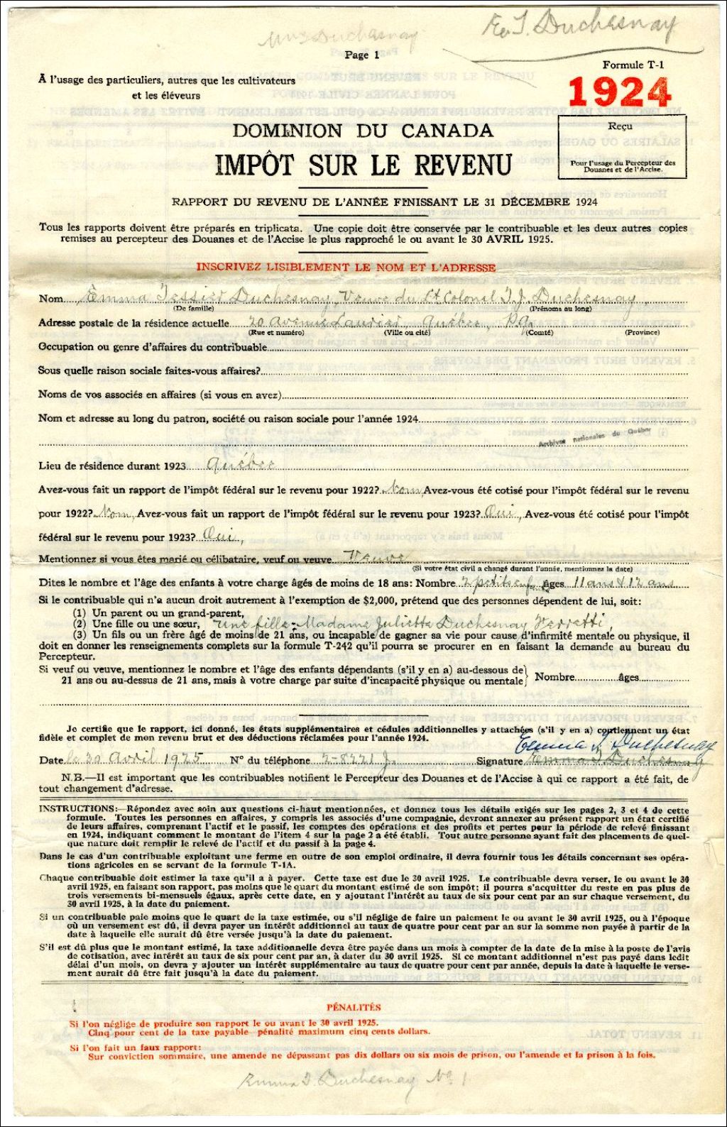 Rapport d'impôt sur le revenu avec avis de cotisation et reçu d'Emma Tessier veuve d'Henri-Théodore Juchereau Duchesnay