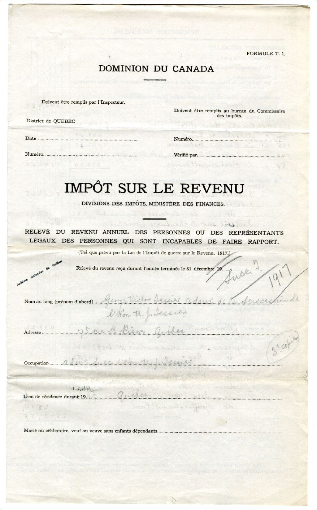 - Rapport d'impôt sur le revenu avec annexes de la succession d'Ulric-Joseph Tessier