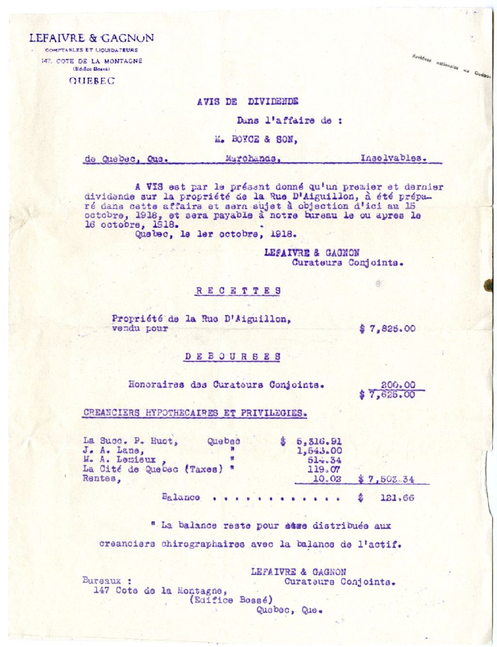 Avis de dividende dans l'affaire Boyce & Son, 1 octobre 1918, Archives nationales à Rimouski, Fonds Famille Tessier, (01R,P1,S7,P112).