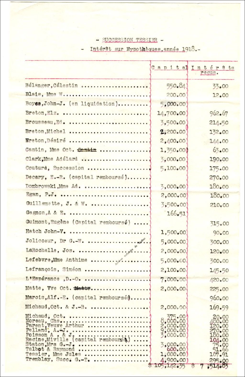 - Annexes du rapport d'impôt sur le revenu de la succession d'Ulric-Joseph Tessier