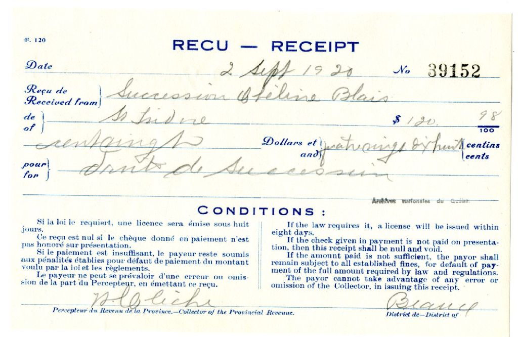 Reçu octroyé par le Percepteur du Revenu de la Province pour la succession d'Obéline Blais