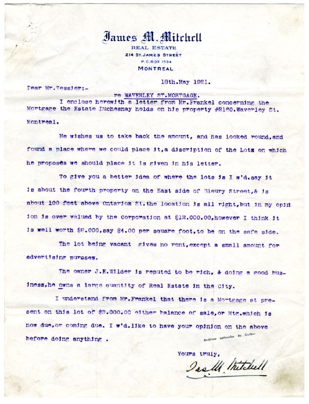 Lettre de James M. Mitchell à [Georges-Victor] Tessier concernant la succession d'Henri-Théodore Juchereau Duchesnay