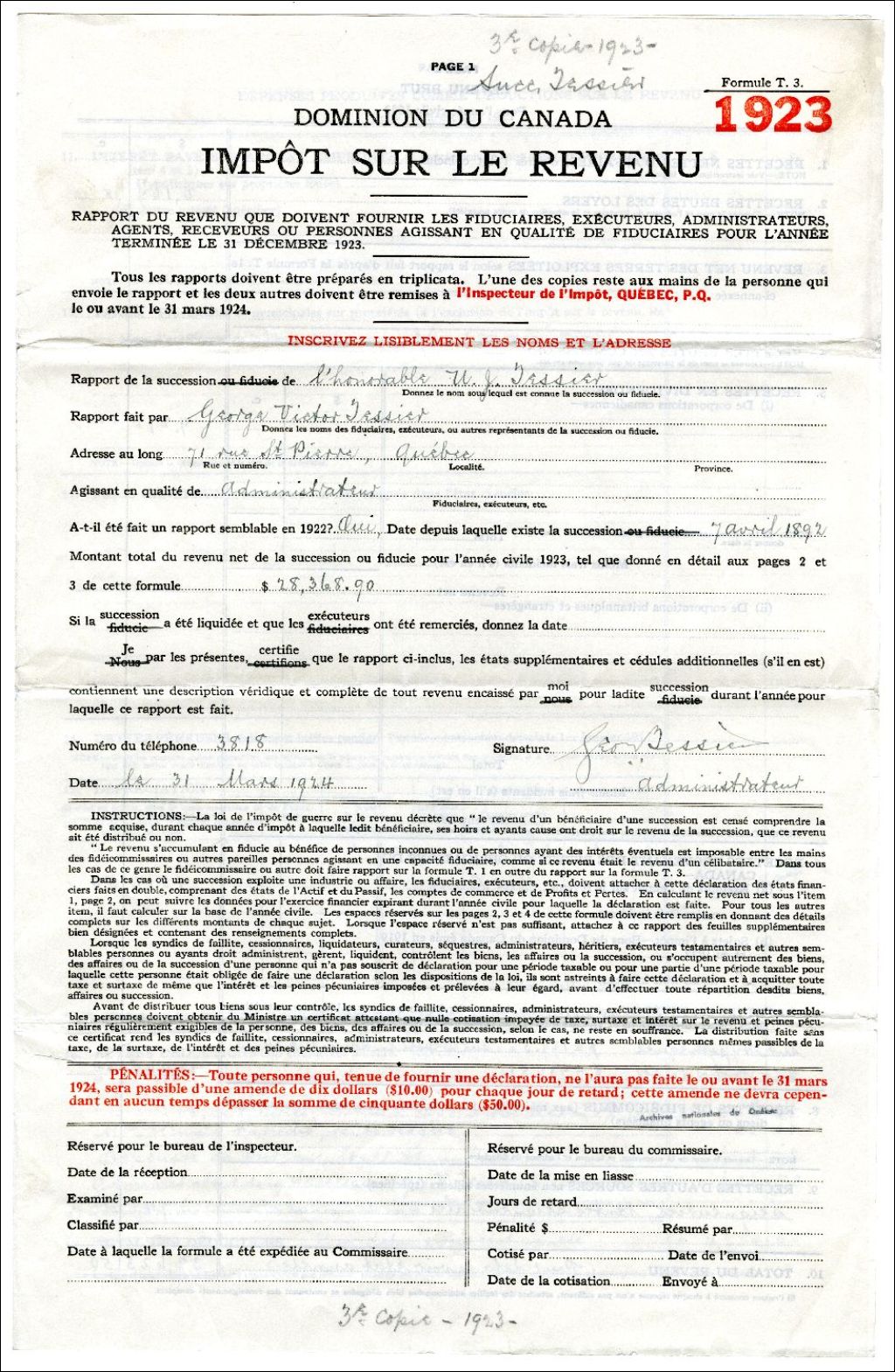 Rapport d'impôt sur le revenu de la succession d'Ulric-Joseph Tessier