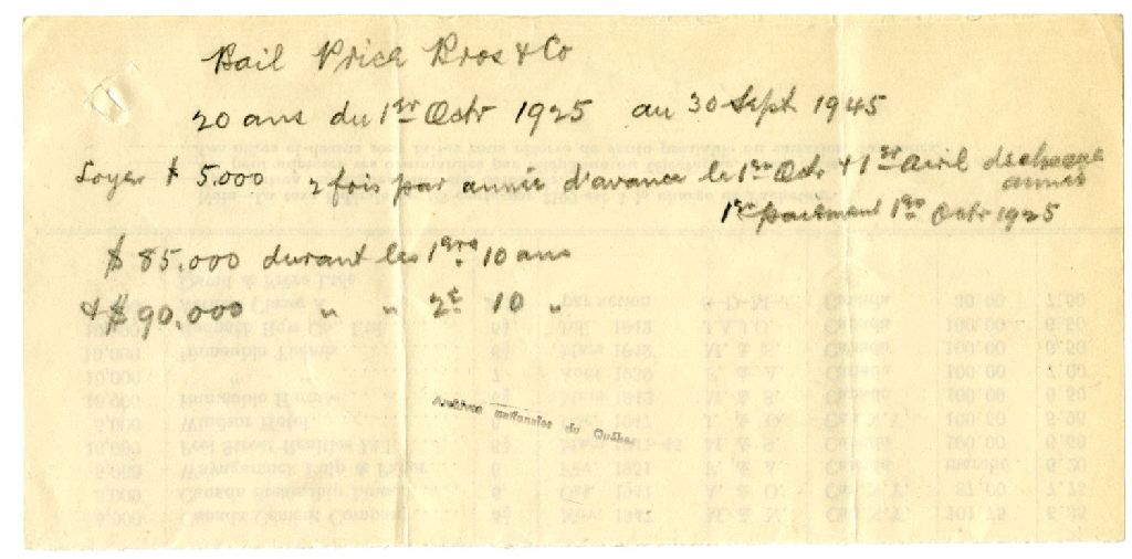 Notes comptables concernant le bail de Price Brothers & Company