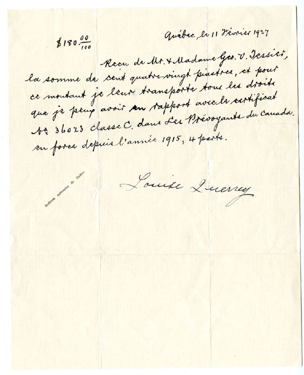 Reçu octroyé à Georges-Victor Tessier et sa femme par Louise Querrey pour le paiement du transport de ses parts avec les Prévoyants du Canada