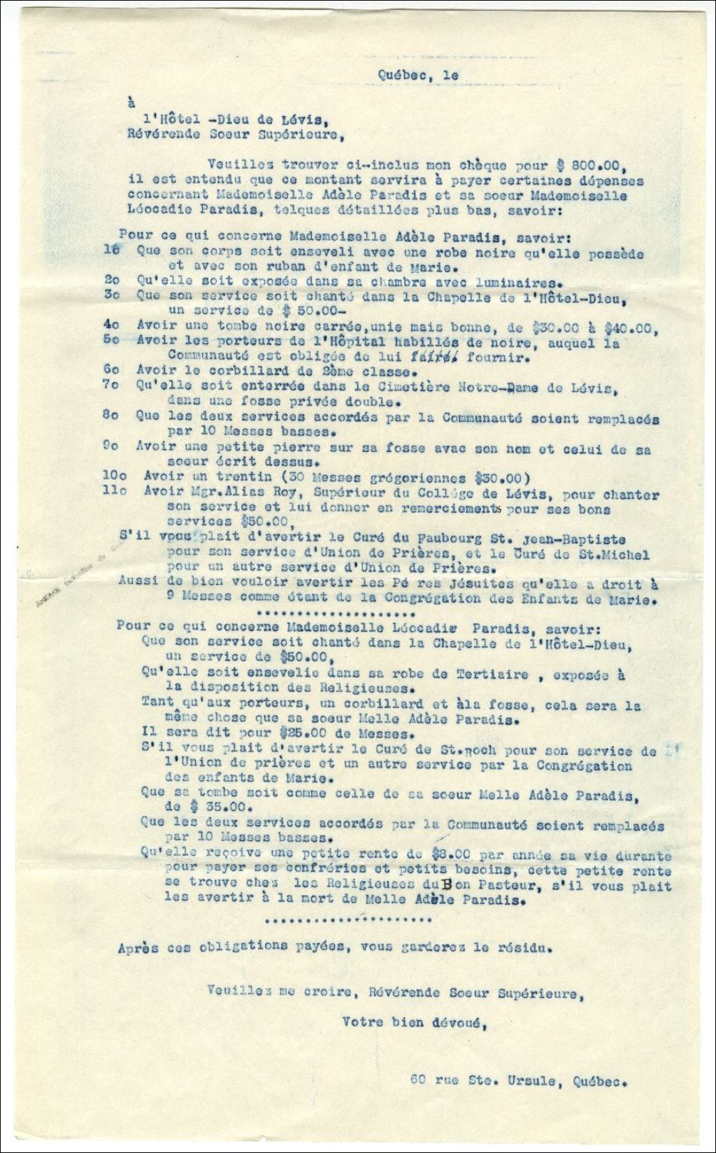 Lettre de [Georges-Victor Tessier] à la Révérende Sœur Supérieur de l'Hôtel-Dieu de Lévis concernant les dernières volontés d'Adèle et Léocadie Paradis
