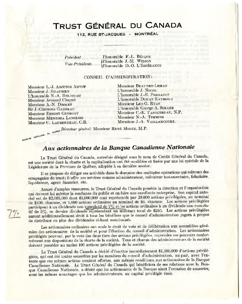 - Lettre du Trust Général du Canada aux actionnaires de la Banque Canadienne nationale