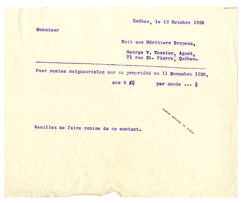 Facture de Georges-Victor Tessier pour les rentes seigneuriales