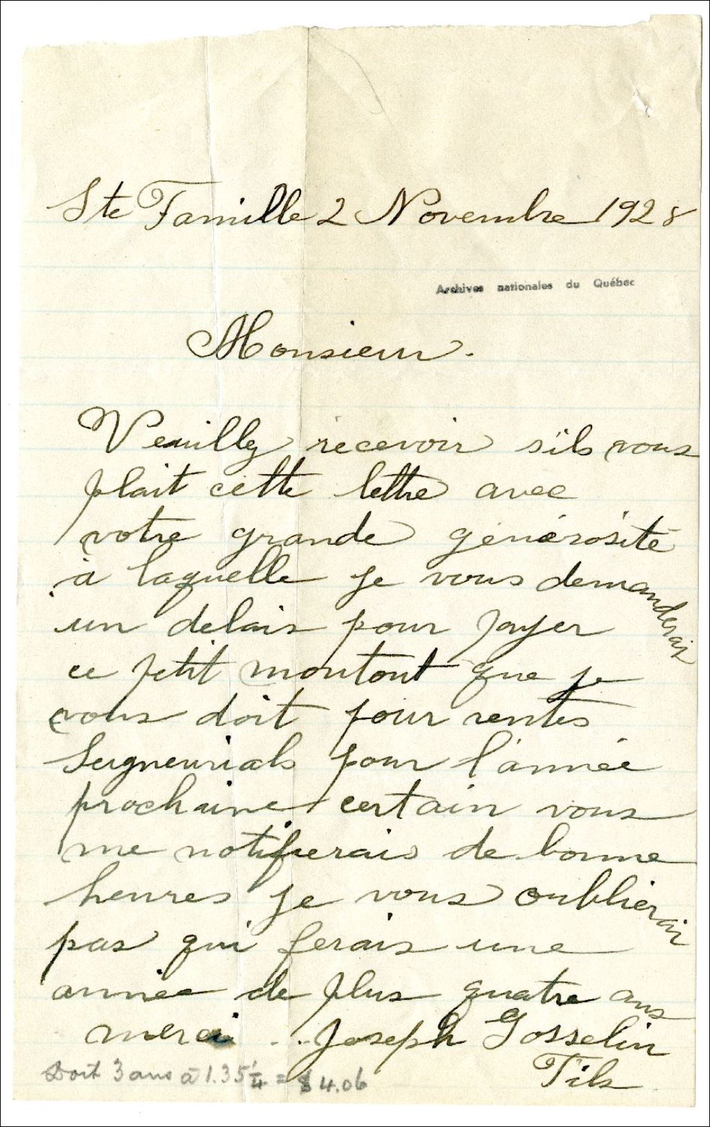 Lettre de Joseph Gosselin concernant le paiement des rentes seigneuriales