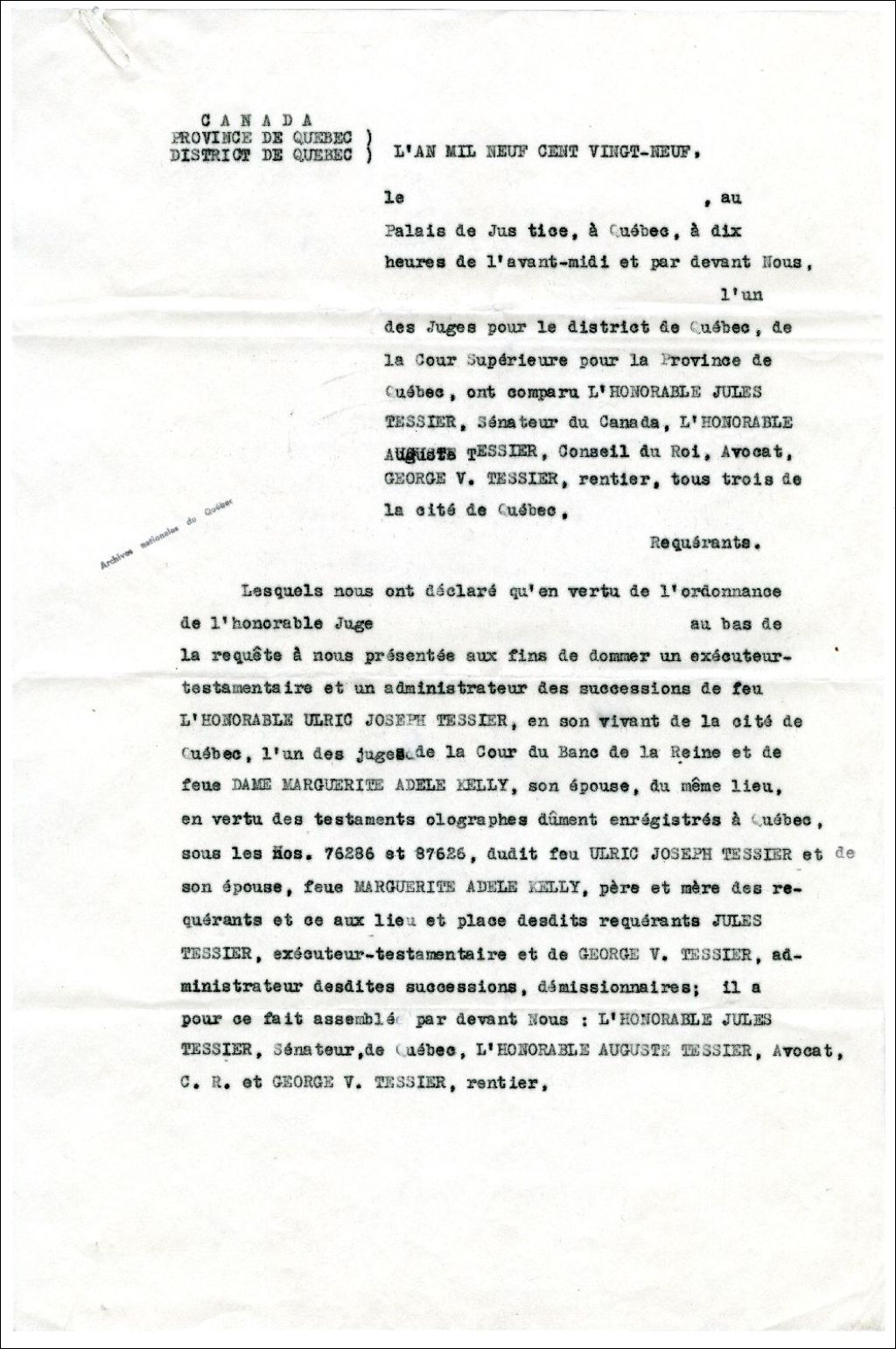 Nomination de la Royal Trust Company comme l'un des exécuteur testamentaire de la succession d'Ulric-Joseph Tessier, 1929, Archives nationales à Rimouski, Fonds Famille Tessier, (01R,P1,S7,P246).