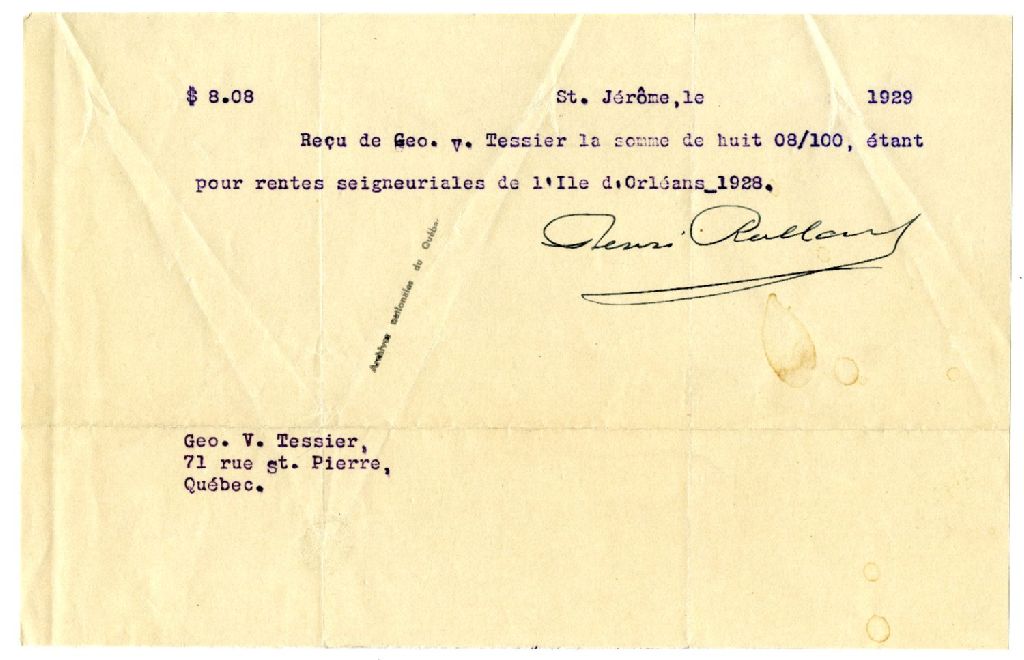 Reçu octroyé à Georges-Victor Tessier par Henri Rolland pour le paiement des rentes seigneuriales de l'Île d'Orléans