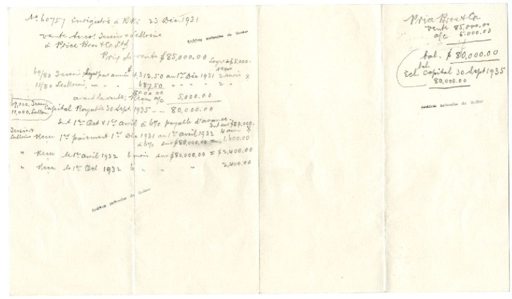 Notes concernant la vente par la succession Ulric-Joseph Tessier & autres à la Price Brothers & Company, 1931, Archives nationales à Rimouski, Fonds Famille Tessier, (01R,P1,S7,P269).