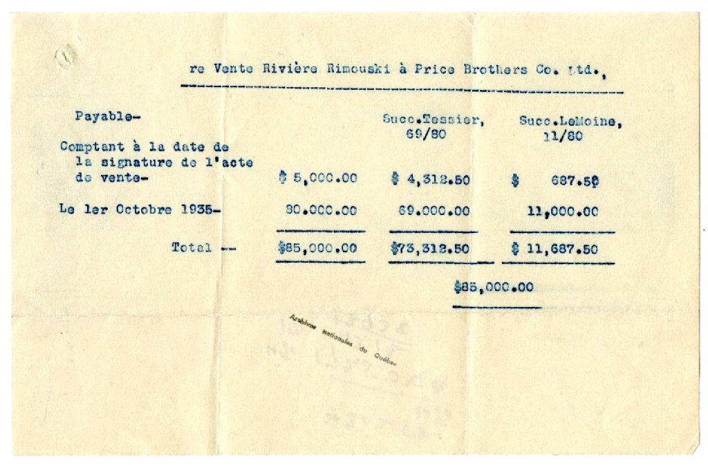 Notes comptables concernant la vente de la Rivière Rimouski à Price Brothers & Company par les successions Tessier et LeMoine, 1931, Archives nationales à Rimouski, Fonds Famille Tessier, (01R,P1,S7,P270).