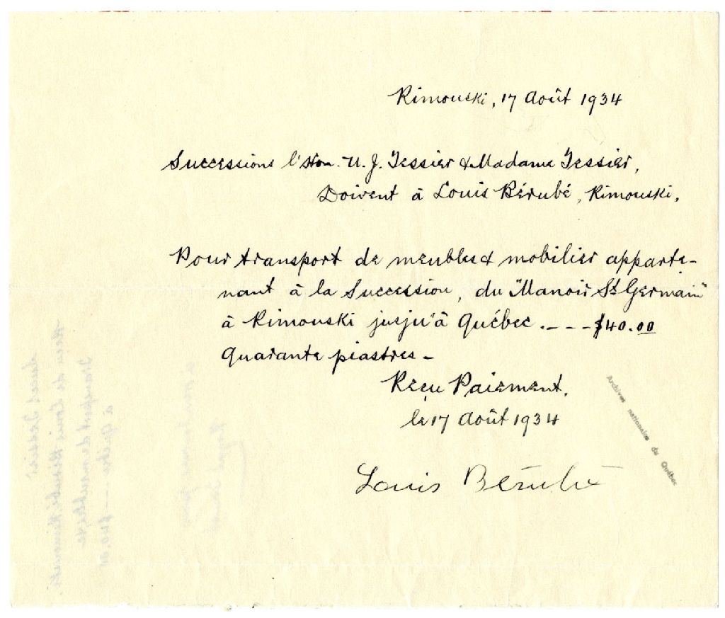 Reçu du paiement du déménagement et de l'entreposage des meubles, 17 août 1934, Archives nationales à Rimouski, Fonds Famille Tessier, (01R,P1,S7,P282).