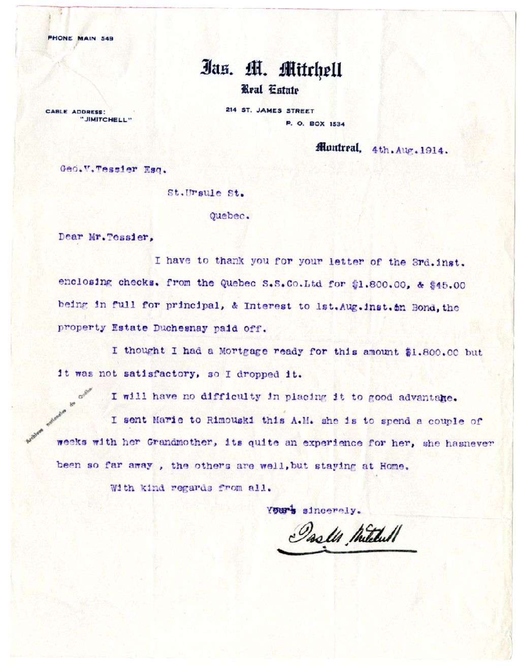 Lettre de James M. Mitchell à Georges-Victor Tessier concernant la succession d'Henri-Théodore Juchereau Duchesnay, 4 août 1914, Archives nationales à Rimouski, Fonds Famille Tessier, (01R,P1,S7,P31).