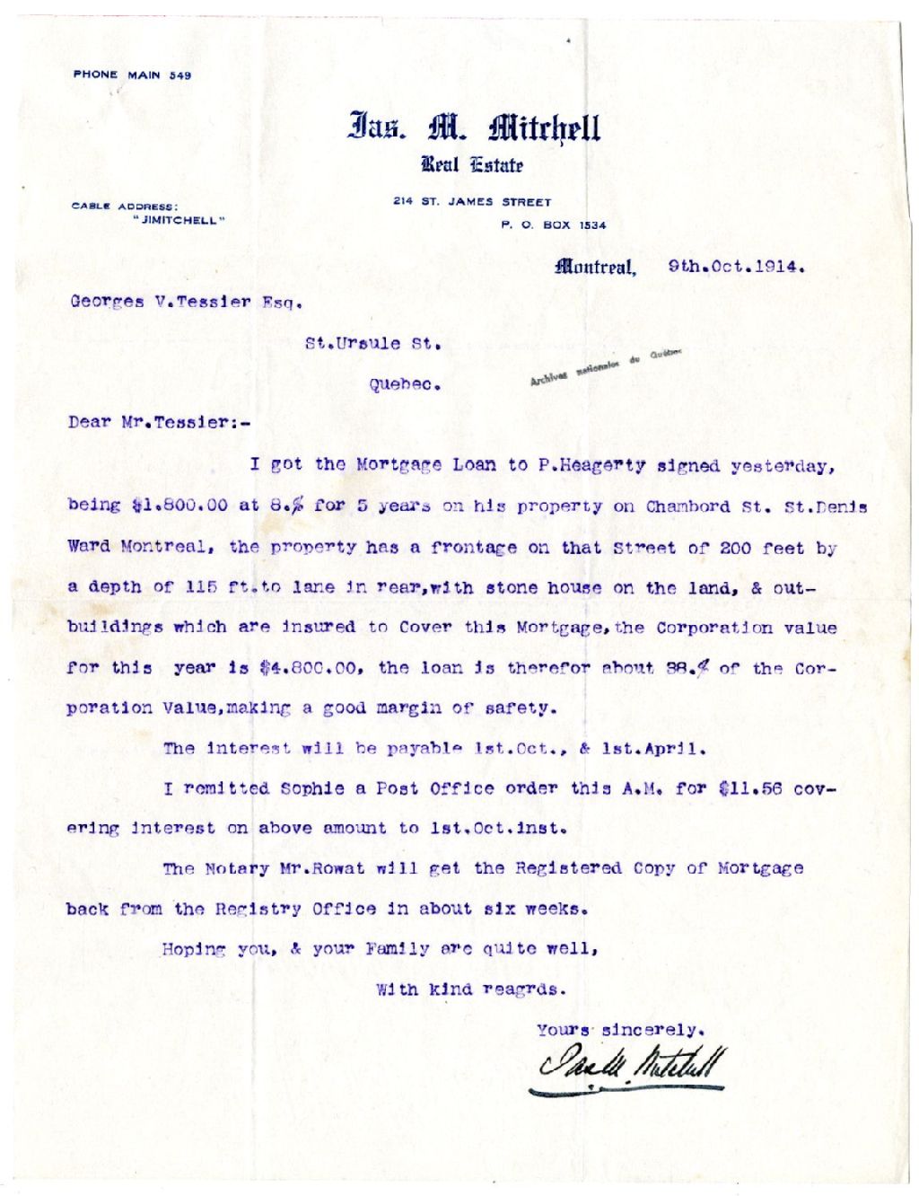 Lettre de James M. Mitchell à Georges-Victor Tessier concernant la succession d'Henri-Théodore Juchereau Duchesnay, 9 octobre 1914, Archives nationales à Rimouski, Fonds Famille Tessier, (01R,P1,S7,P34).