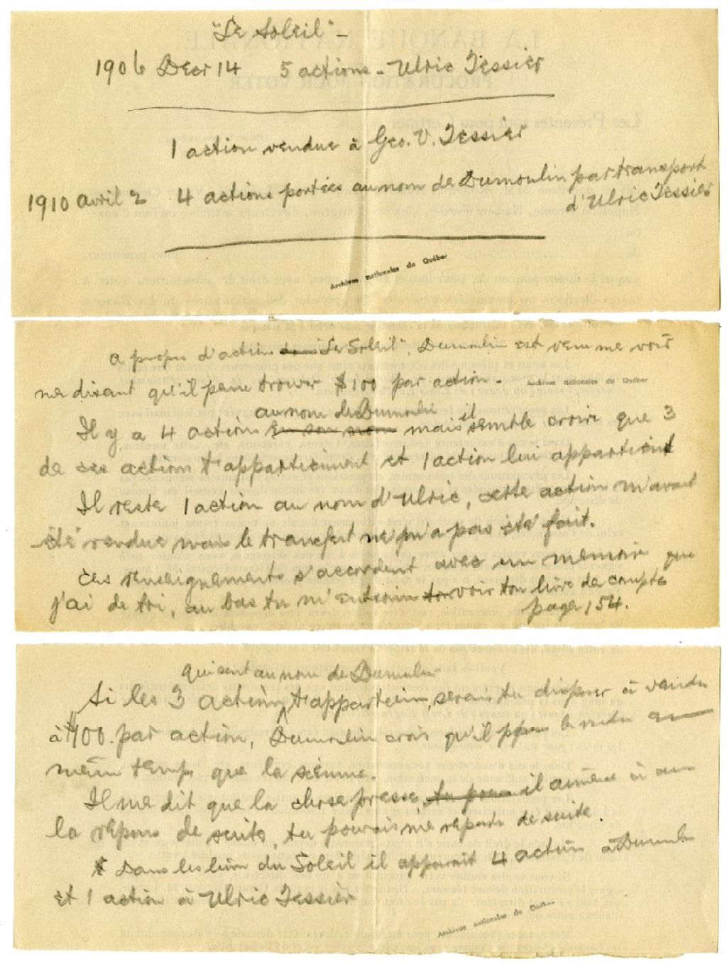 Notes manuscrites relatives à des actions de la Compagnie de publication Le Soleil Limitée