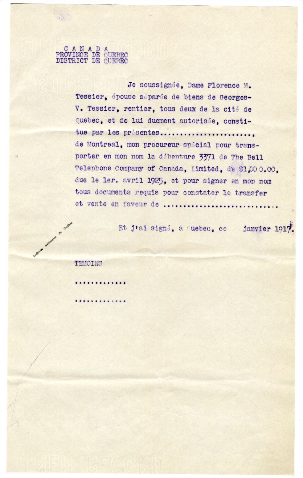 Procuration de Florence M. [Myrand] Tessier nommant Georges-Victor Tessier procureur pour le transport d'actions de Bell Telephone Company of Canada Ltd, janvier 1917, Archives nationales à Rimouski, Fonds Famille Tessier, (01R,P1,S7,P77).