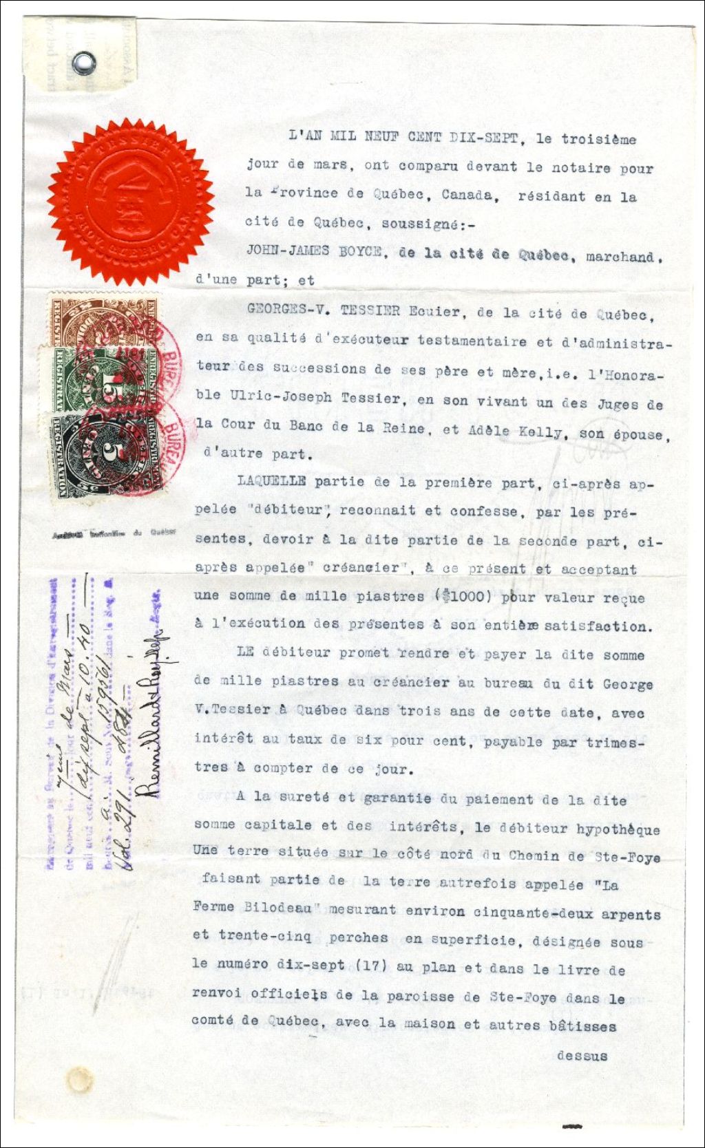 Obligation de John J. Boyce à la succession Ulric-Joseph Tessier, 3 mars 1917, Archives nationales à Rimouski, Fonds Famille Tessier, (01R,P1,S7,P91).