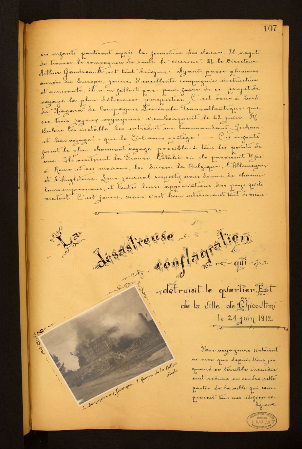 Voyage en Europe de Vincent et Antoine Dubuc [suite]; La désastreuse conflagration qui détruisit le quartier est de la ville de Chicoutimi le 24 juin 1912 [photographie]
