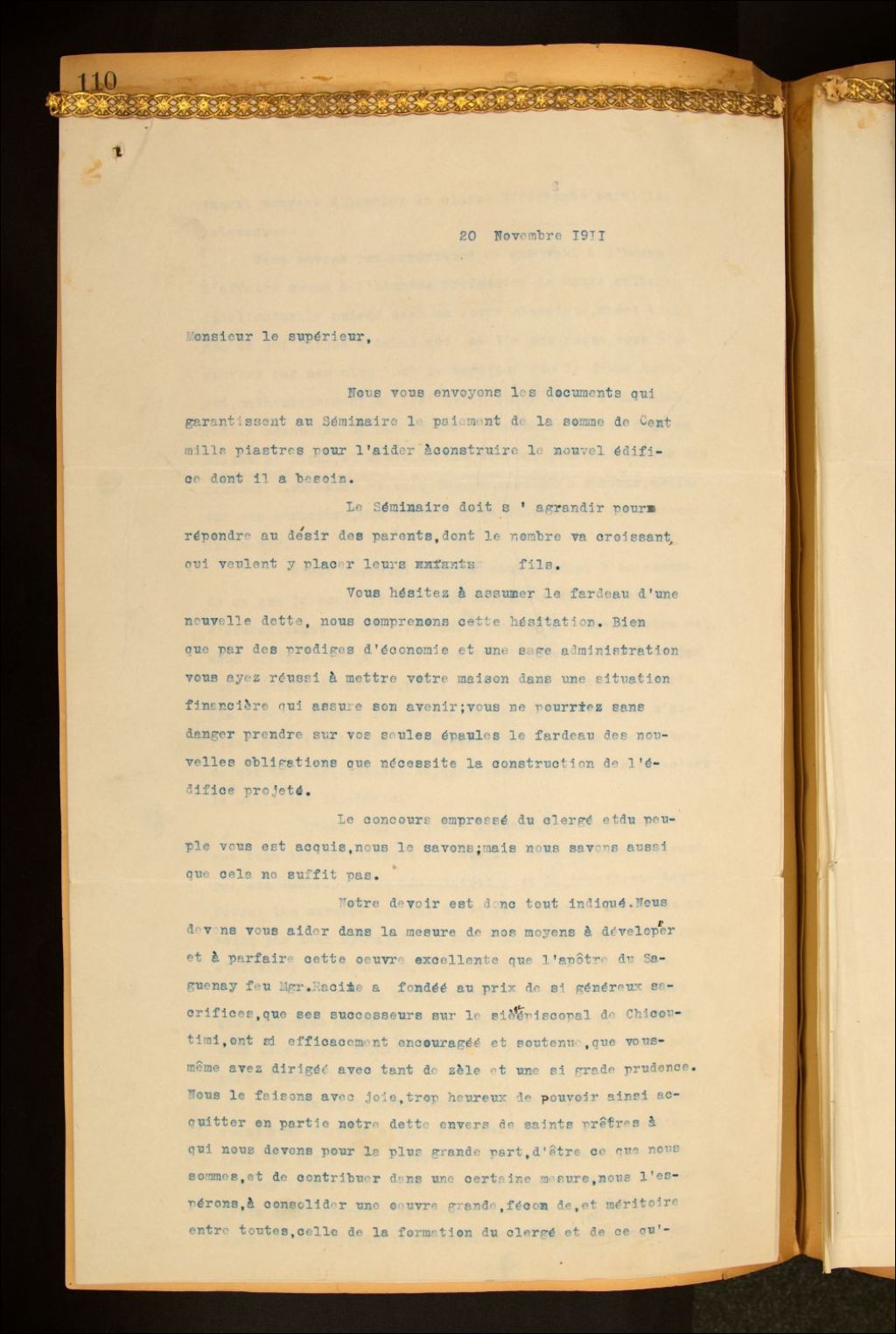 Lettre de J. E. A. Dubuc et J. E. Cloutier à J. Alfred Tremblay, supérieur du Séminaire de Chicoutimi, 20 novembre 1911, Archives nationales à Saguenay, Fonds Famille Dubuc, (02C,P1,D144,P110).