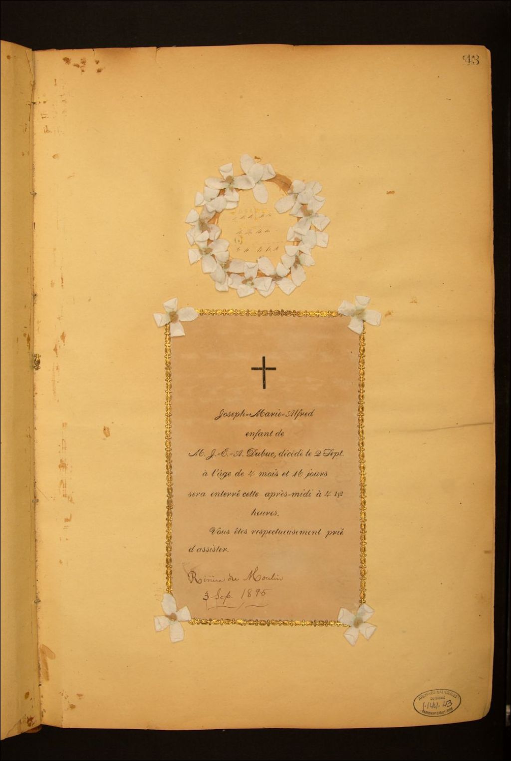 Cette pièce est un souvenir du décès de Joseph Marie Alfred Dubuc, fils de J. E. A. Dubuc et d'Anne-Marie Palardy, survenu le 2 septembre 1895, alors qu'il était âgé de 4 mois