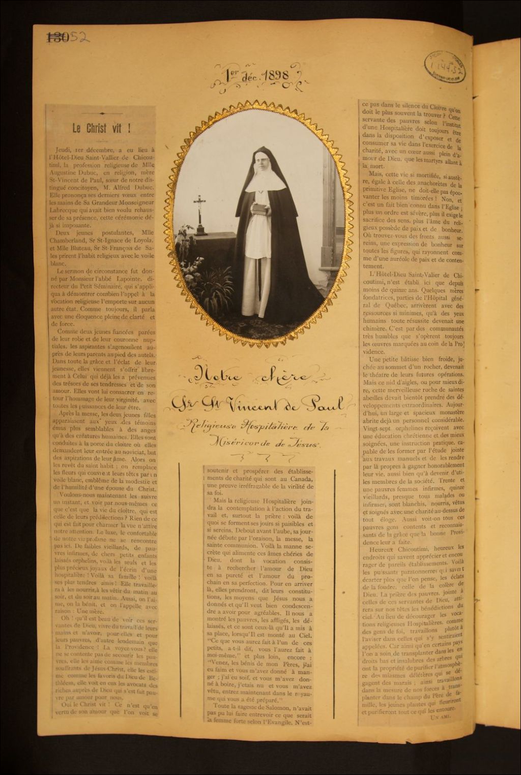 Coupures de journaux portant sur la profession religieuse de Augustine Dubuc, en religion soeur St-Vincent de Paul, et sur les Hospitalières de l'Hôtel-Dieu St-Vallier, 1 décembre 1898, Archives nationales à Saguenay, Fonds Famille Dubuc, (02C,P1,D144,P52).