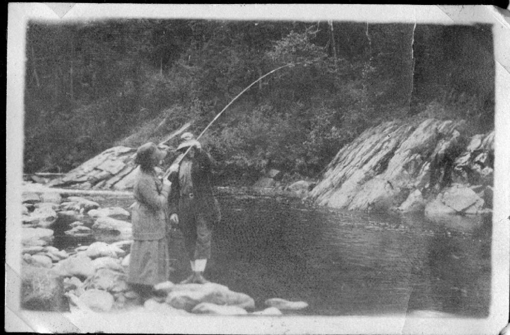Agnès Nault aidée d'un guide s'affaire à pêcher un saumon sur la rivière de l'Ouest [rivière du Grand-Pabos-Ouest?]