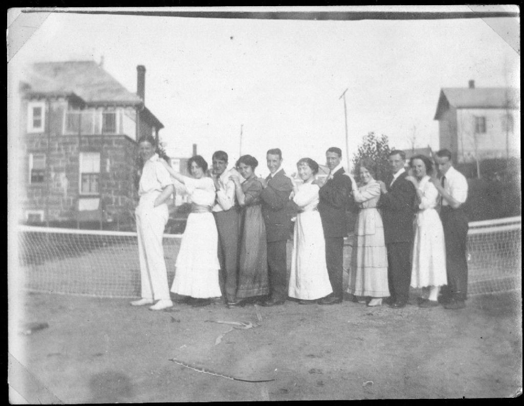 Redgie Chadmick, Mlle ?, Antoine Dubuc, Jeanne Mignault, C.-E. Boivin, Cécile Migneault, V.-de-P. Beaulieu, Cécile Desautels, Vincent Dubuc, Agnès Nault, Thomas Boivin, [Après 1910], Archives nationales à Saguenay, Fonds Famille Dubuc, (02C,P1,D172,P38-6), Photographe non identifié.