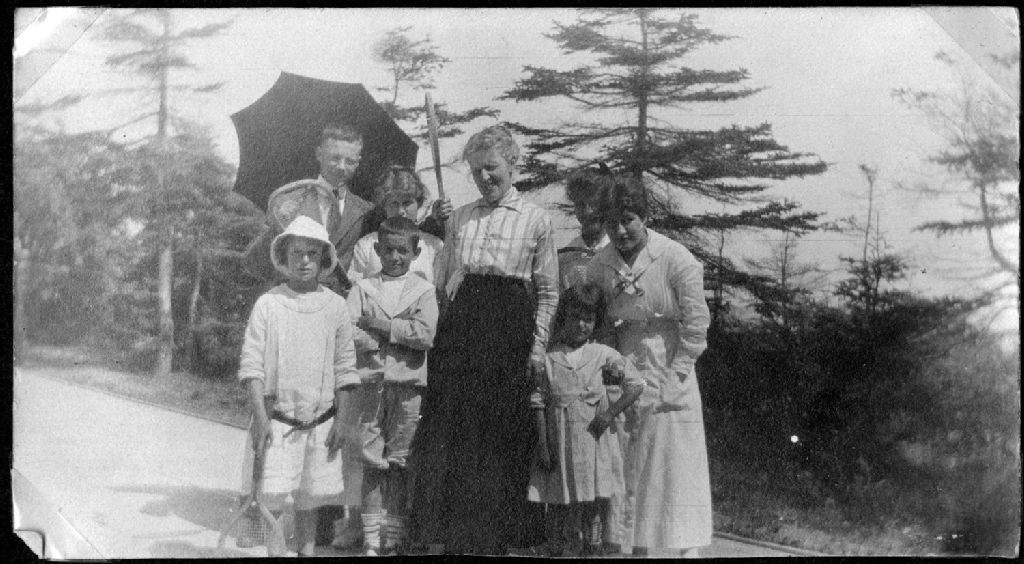 Marthe, Lionel, Jacques, Cécile, Mme Desautels, Françoise, Marie-Ange, Esther, [Après 1910], Archives nationales à Saguenay, Fonds Famille Dubuc, (02C,P1,D172,P49-6), Photographe non identifié.