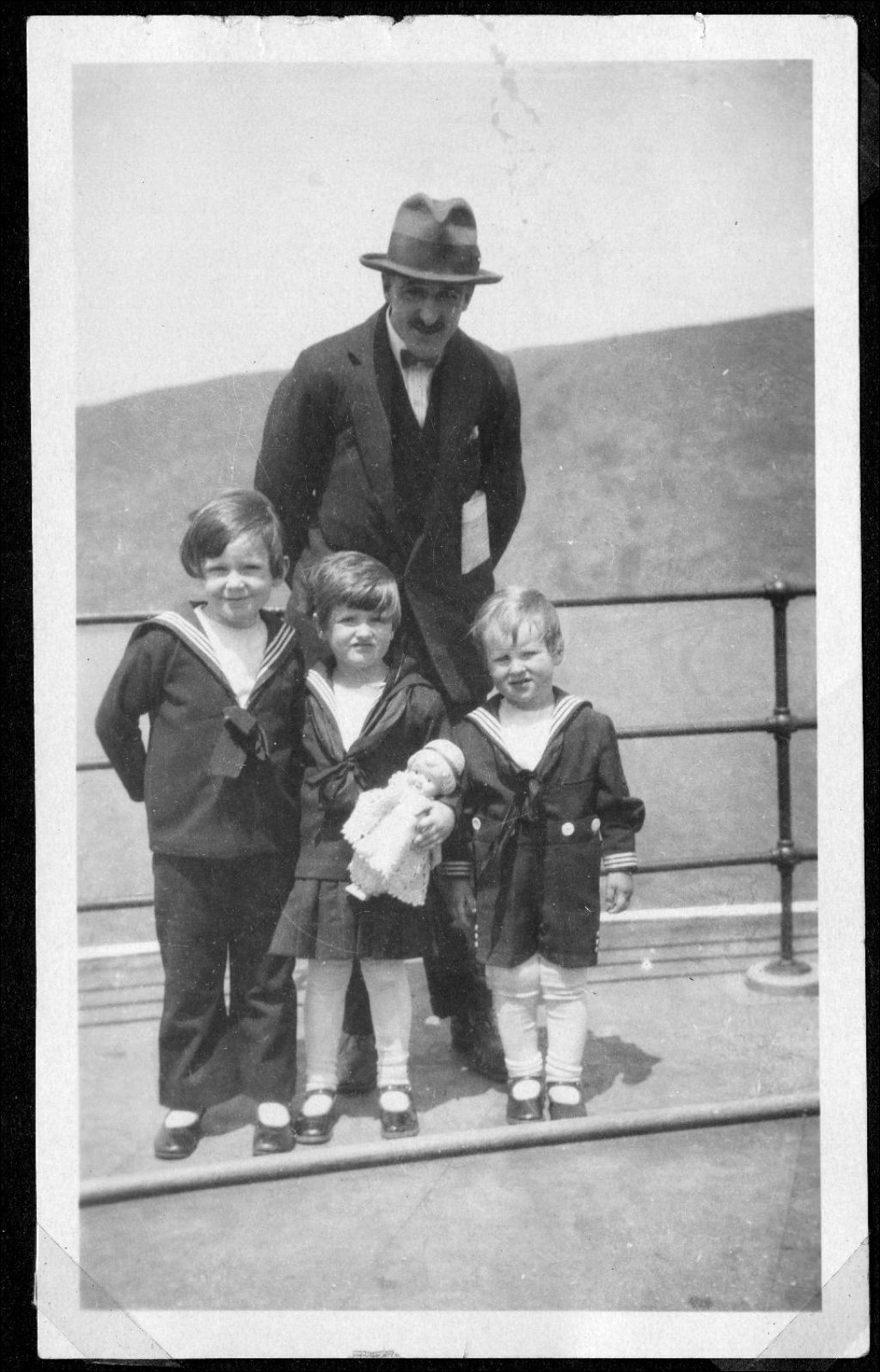 Antoine Dubuc avec Jean, Marie et Louis sur un bateau de la Canada Steamship, [Après 1910], Archives nationales à Saguenay, Fonds Famille Dubuc, (02C,P1,D172,P58-3), Photographe non identifié.
