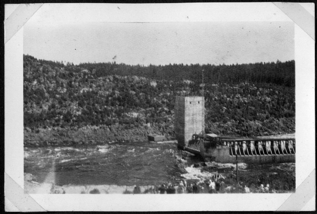 L'obélisque de ciment qu'on fait tomber dans le Saguenay pour la construction du barrage du Saguenay, au pouvoir de Shipshaw