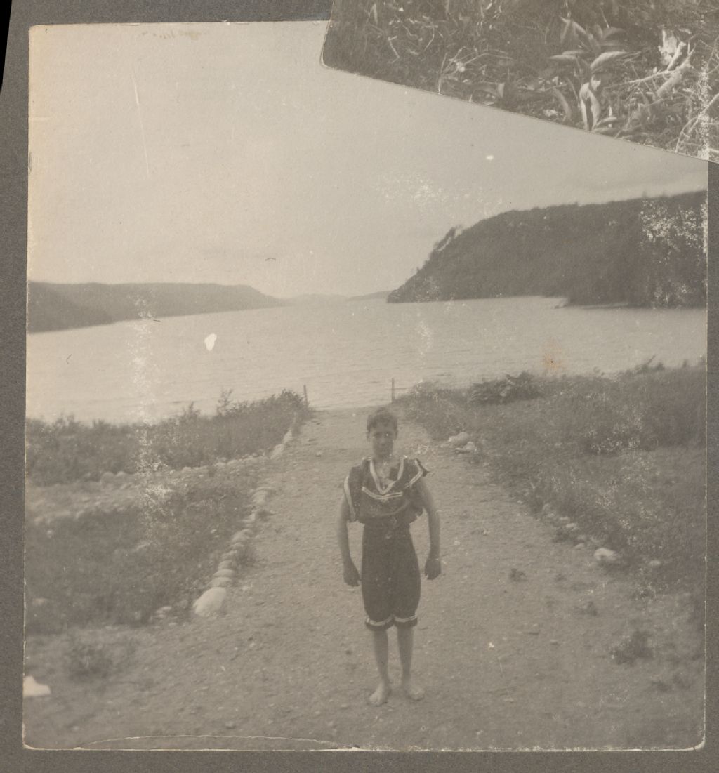 Vincent-de-Paul Beaulieu dans le maillot de bain de sa cousine, [Après 1910], Archives nationales à Saguenay, Fonds Famille Dubuc, (02C,P1,D173,P52-3), Photographe non identifié.