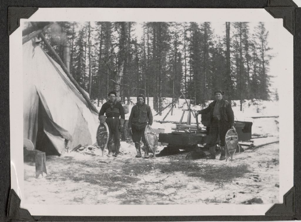 Trois hommes tenant des raquettes à neige devant une tente, 1937, Archives nationales à Saguenay, Fonds Famille Dubuc, (02C,P1,D174,P6-4), Photographe non identifié.