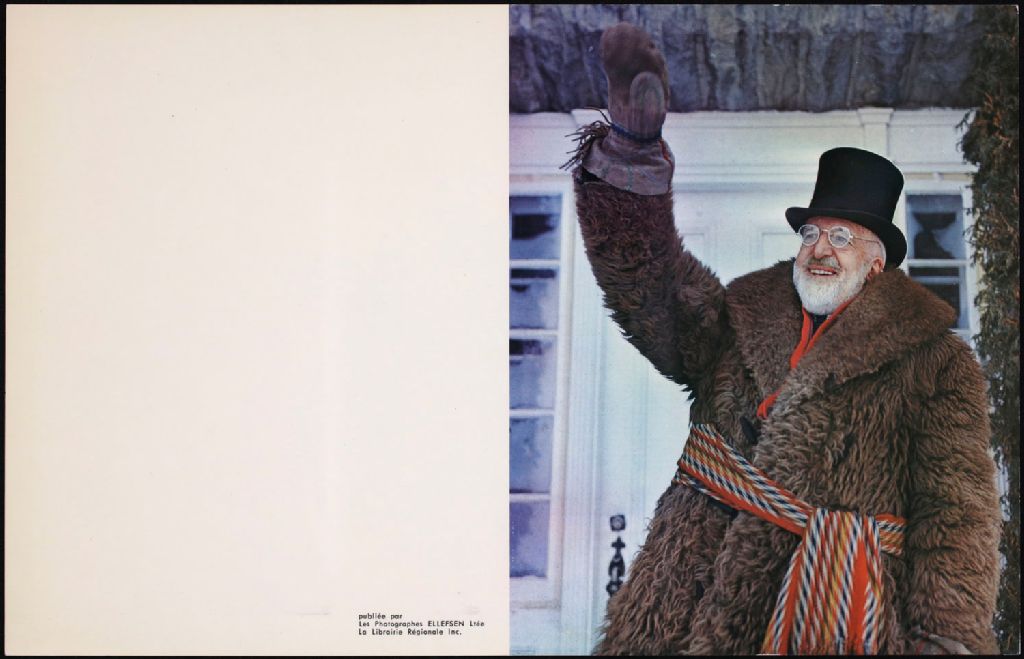 Carte de souhait du carnaval souvenir de Chicoutimi, 1861-1961. Le personnage est m. Antoine Dubuc, 1961, Archives nationales à Saguenay, Fonds Famille Dubuc, (02C,P1,D178.10,P29), Photographe non identifié.