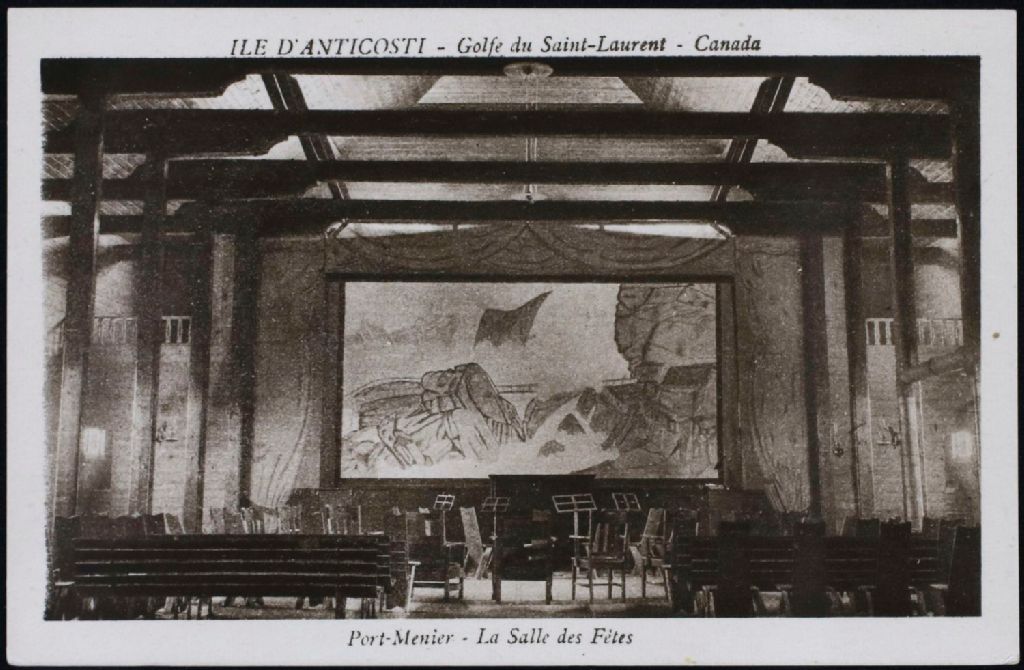 Port Menier, la salle des fêtes, [1922-1950], Archives nationales à Saguenay, Fonds Famille Dubuc, (02C,P1,D178.9,P33), Photographe non identifié.