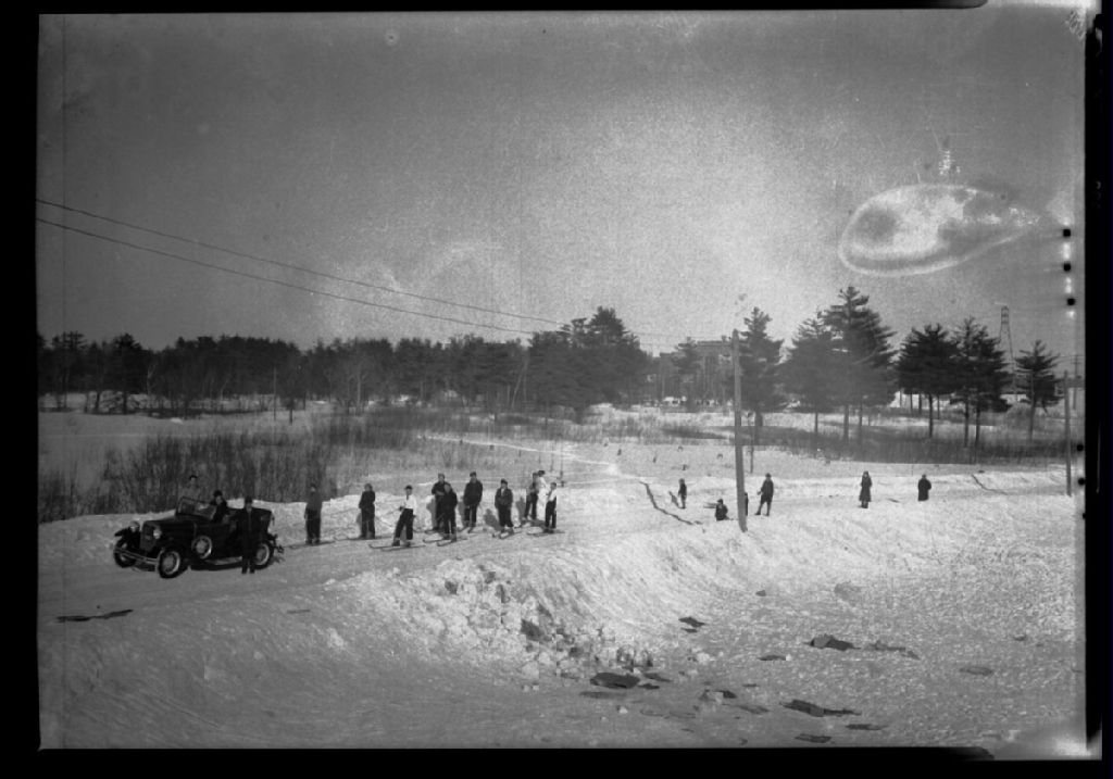 Skieurs dans un sentier, 1935, Archives nationales à Trois-Rivières, Fonds Henri Sauvageau, (04T,P26,D169), Henri Sauvageau.