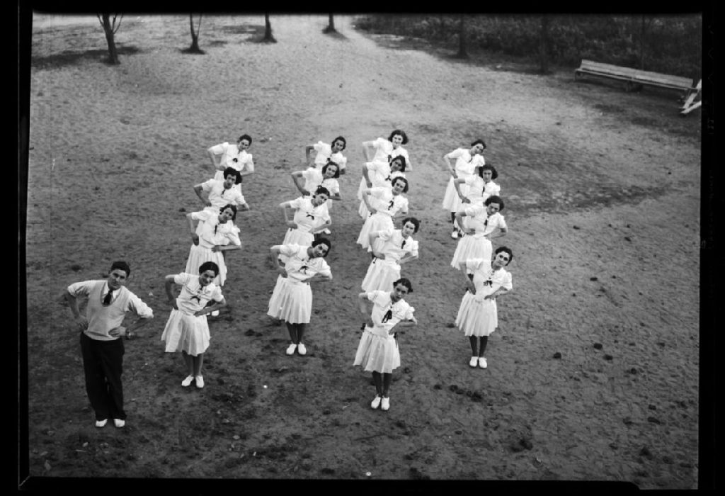 Cours d'éducation physique au couvent de Drummondville, 1945, Archives nationales à Trois-Rivières, Fonds Henri Sauvageau, (04T,P26,D182), Henri Sauvageau.