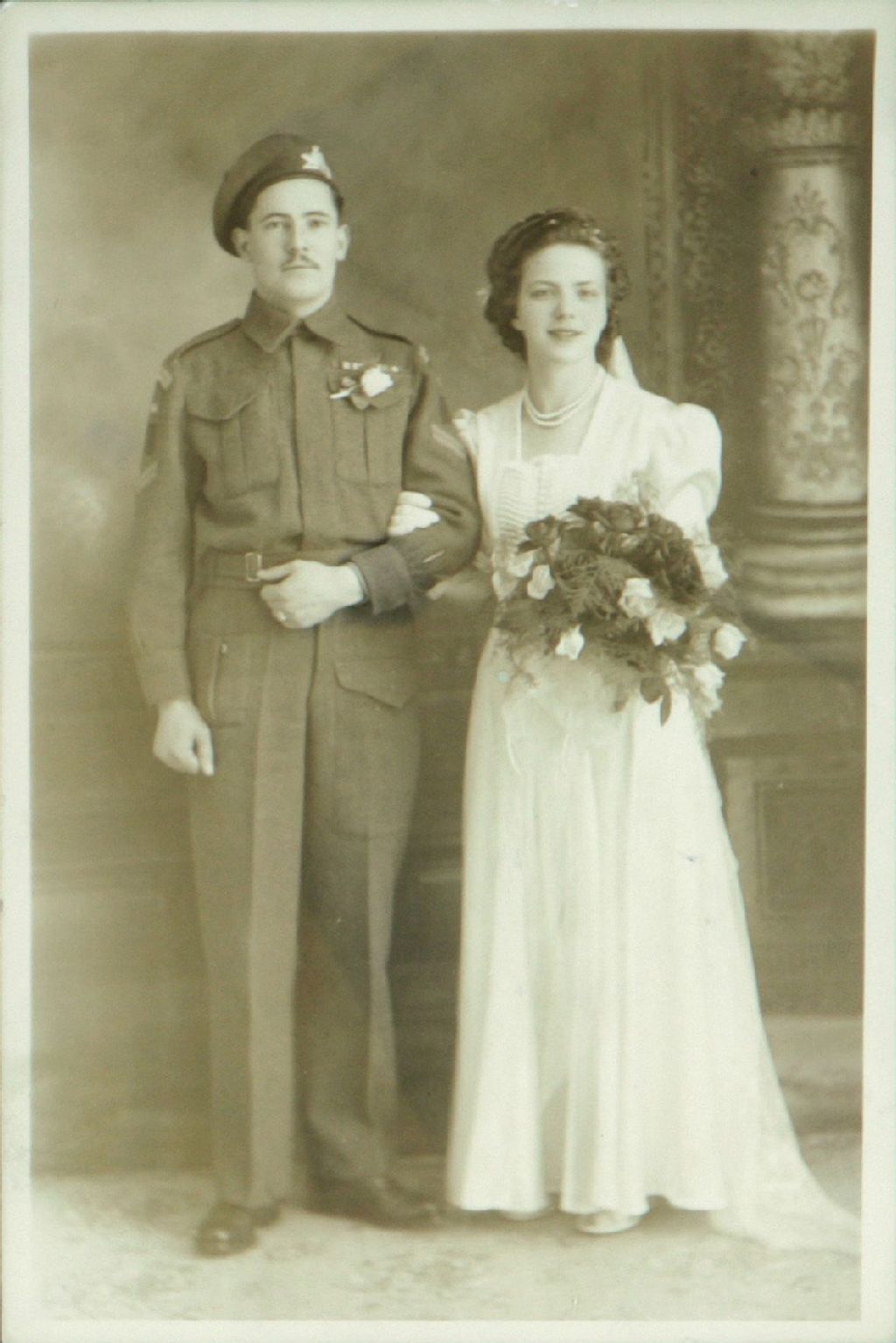 Mariage d'Augustin Demers, en costume militaire, et d'Eva Mercier