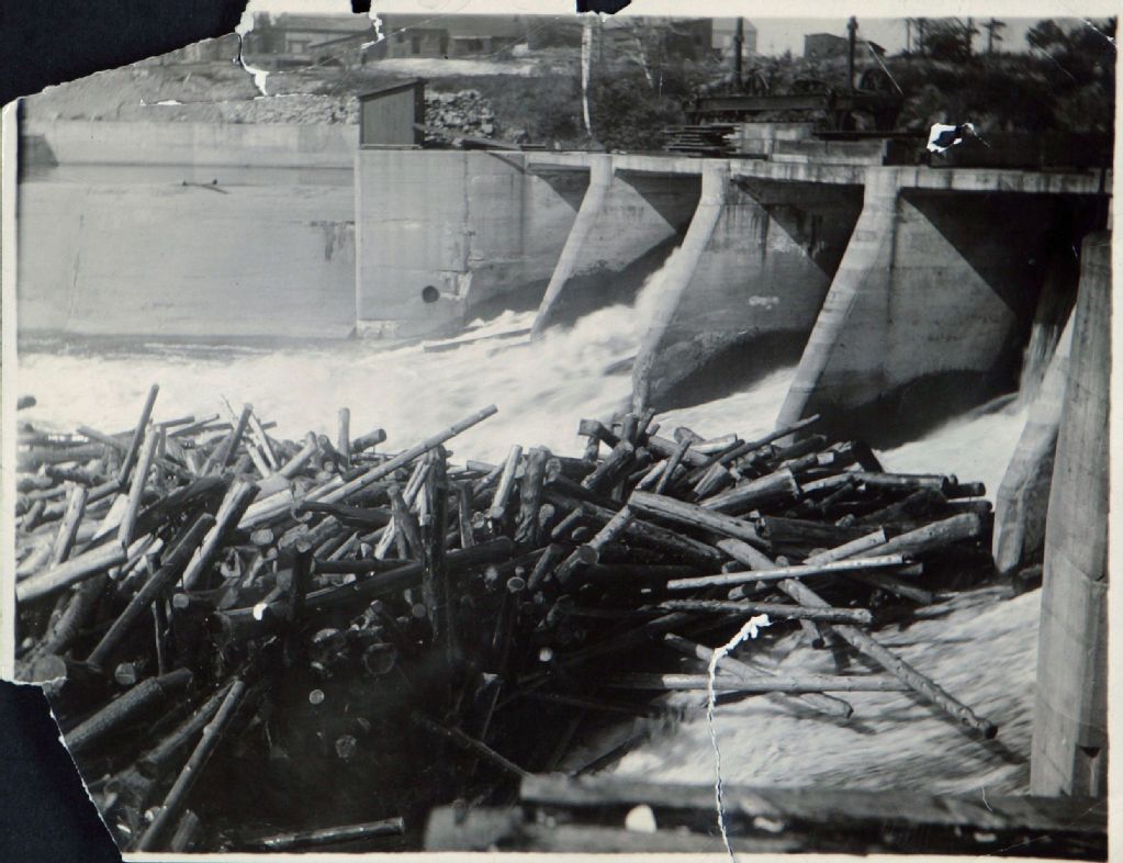 Billots entassés à la sortie d'un barrage près du château d'eau et de l'ERCO à Buckingham
