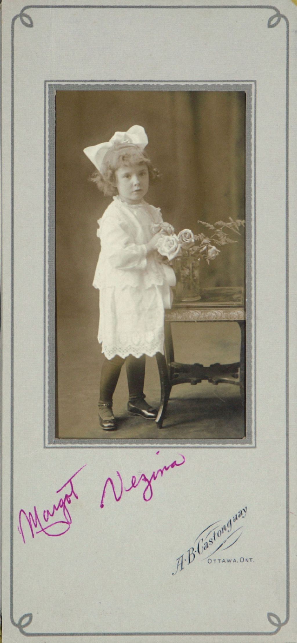 Photographie de Margot Vézina prise par Alec Castonguay, frère de Florence Castonguay (célèbre artiste de la scène). Mmes Castonguay et Vézina devinrent de grandes amies jusqu'au décès de Florence, au cours des années 1990 (informations transmises par M. Denis Boucher, fils de Mme Vézina).