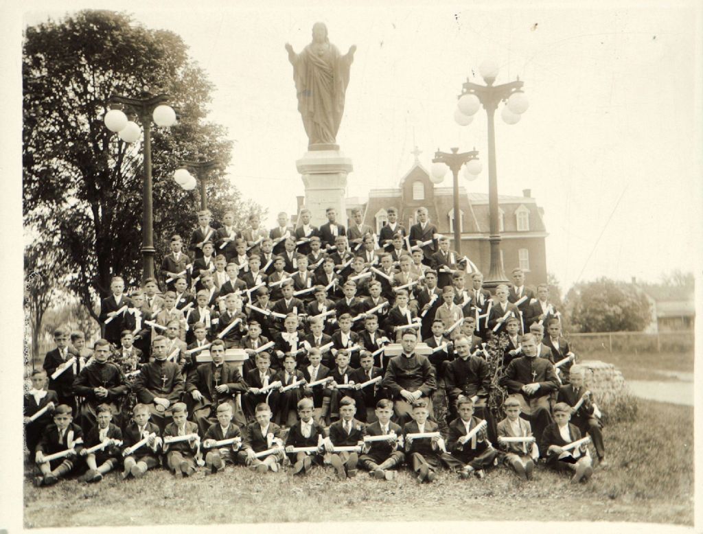Groupe d'environ 75 jeunes garçons, avec en main leur certificat de communion solennelle, accompagnés de six Frères de l'Instruction chrétienne, devant la statue du Sacré-Coeur, avec l'école Saint-Michel à l'arrière-plan, [193-?], Archives nationales à Gatineau, Fonds Rodolphe Léger, (07H,P28,D272), Photographe non identifié.