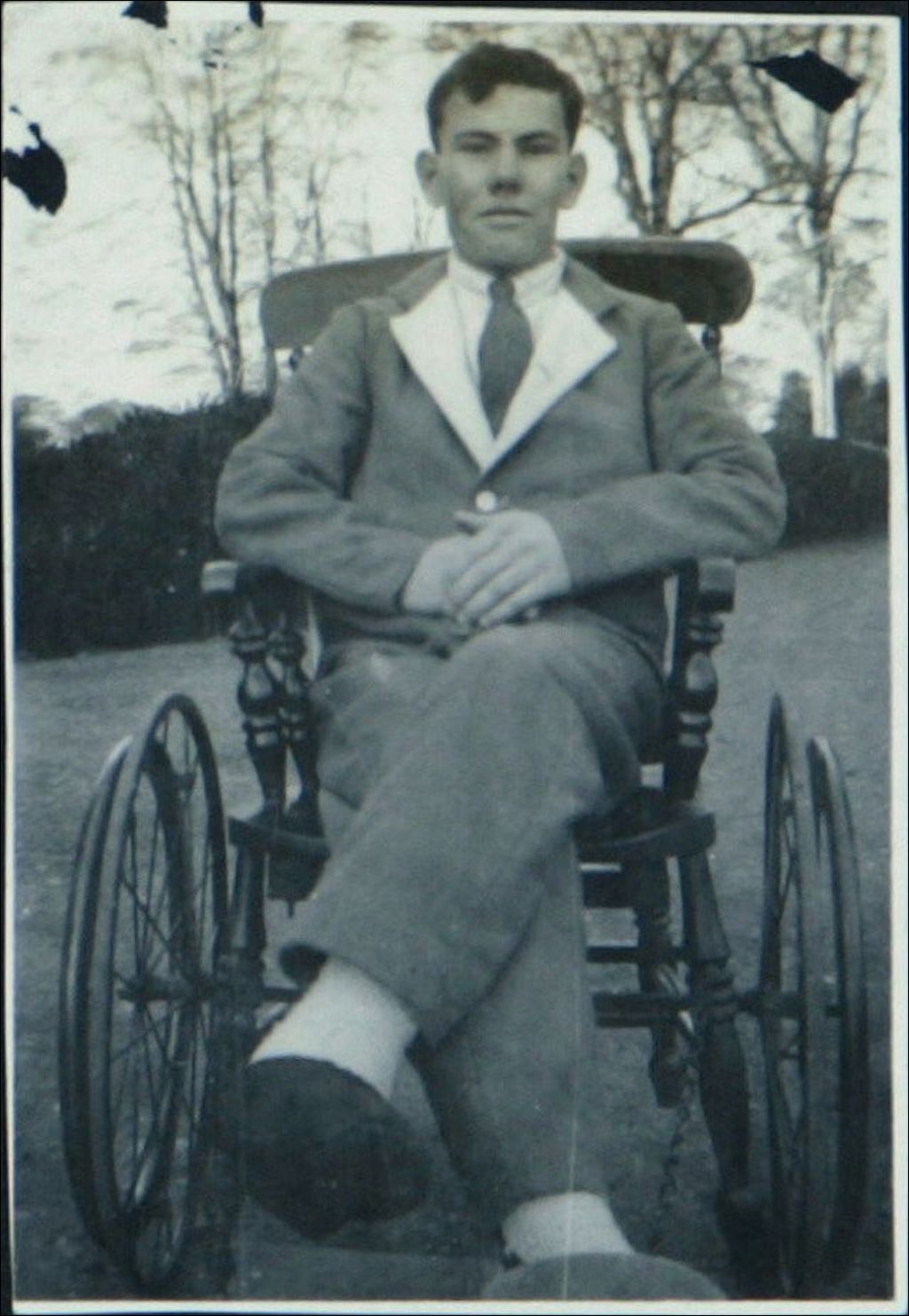 - Jeune homme : en chaise roulante en bois, tenant un appareil photo, tenant une canne, près d'une cordée de bois