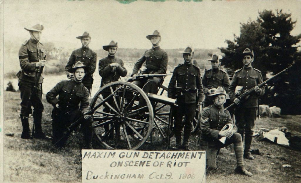 Soldats de l'armée sur la scène du soulèvement des grévistes de la James MacLaren Company à Buckingham = Maxim Gun Detachment on Scene of Riot, Buckingham, Oct. 9, 1906, [1906], Archives nationales à Gatineau, Fonds Rodolphe Léger, (07H,P28,D312), Photographe non identifié.