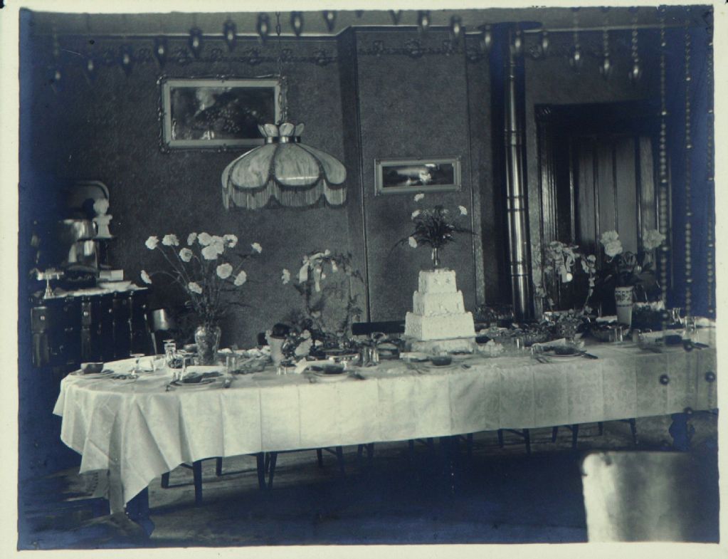 Invités autour d'une table décorée pour les noces d'Aurora Mercie et Elzéar Sabourin, à la résidence de Rodolphe Léger de Buckingham, [193-?], Archives nationales à Gatineau, Fonds Rodolphe Léger, (07H,P28,D369), Photographe non identifié.