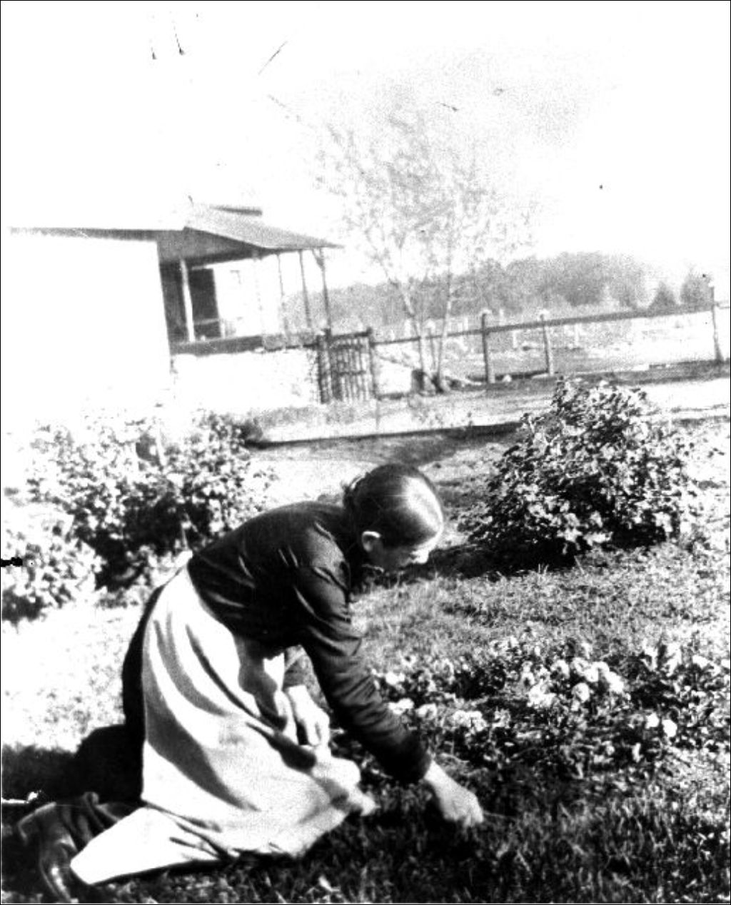 Emma Beauchamp (Mme Fabien Campeau) agenouillée dans son jardin